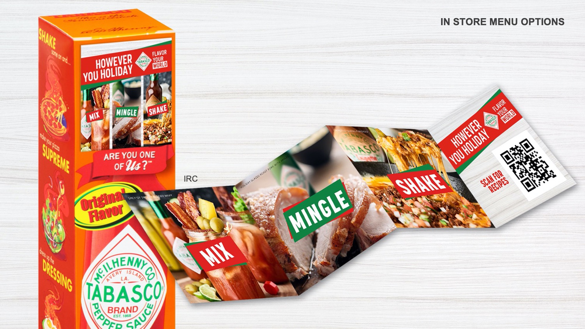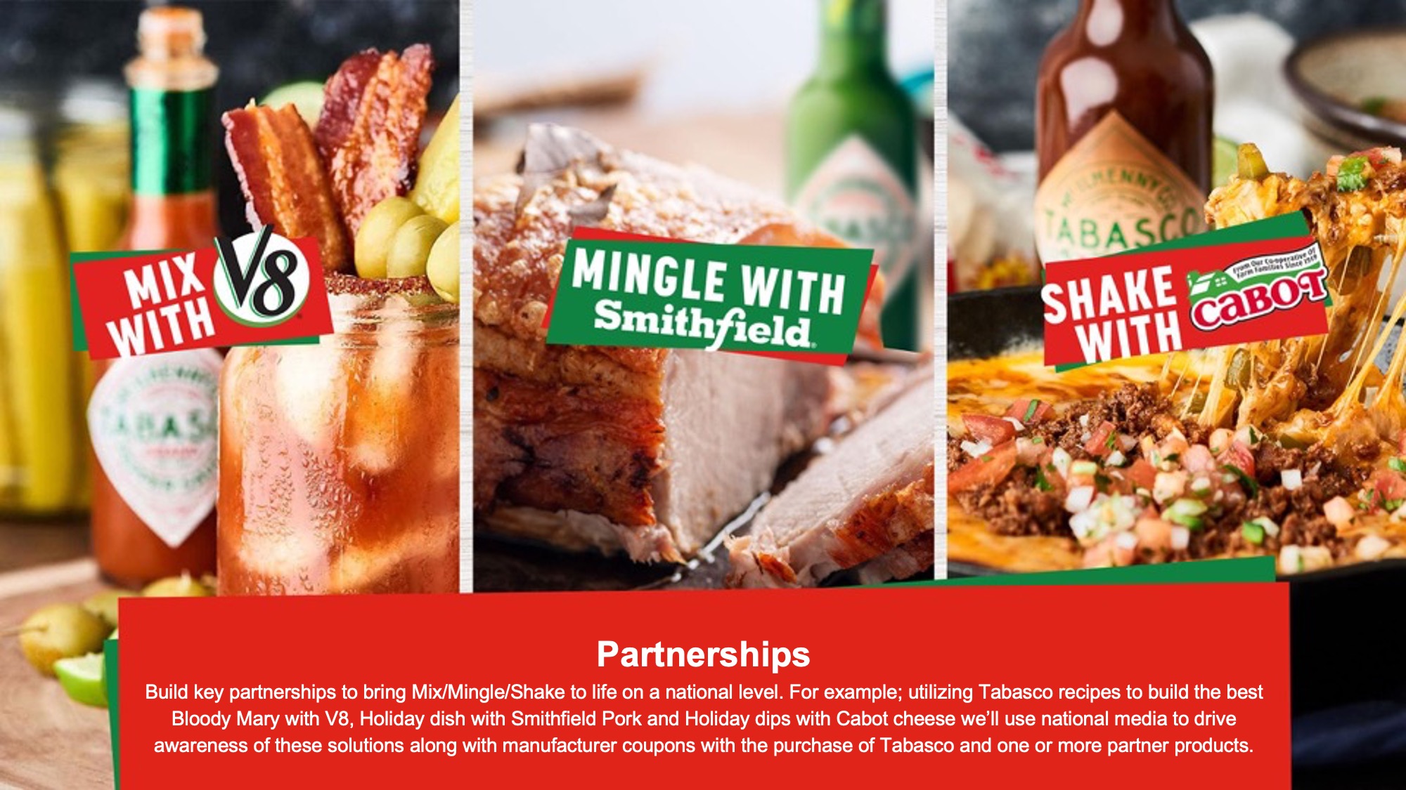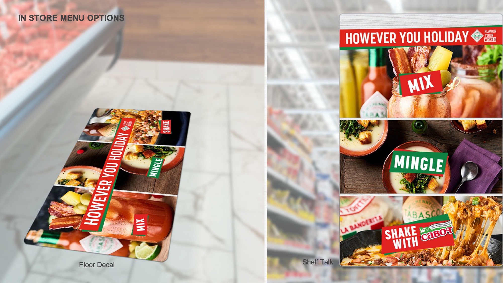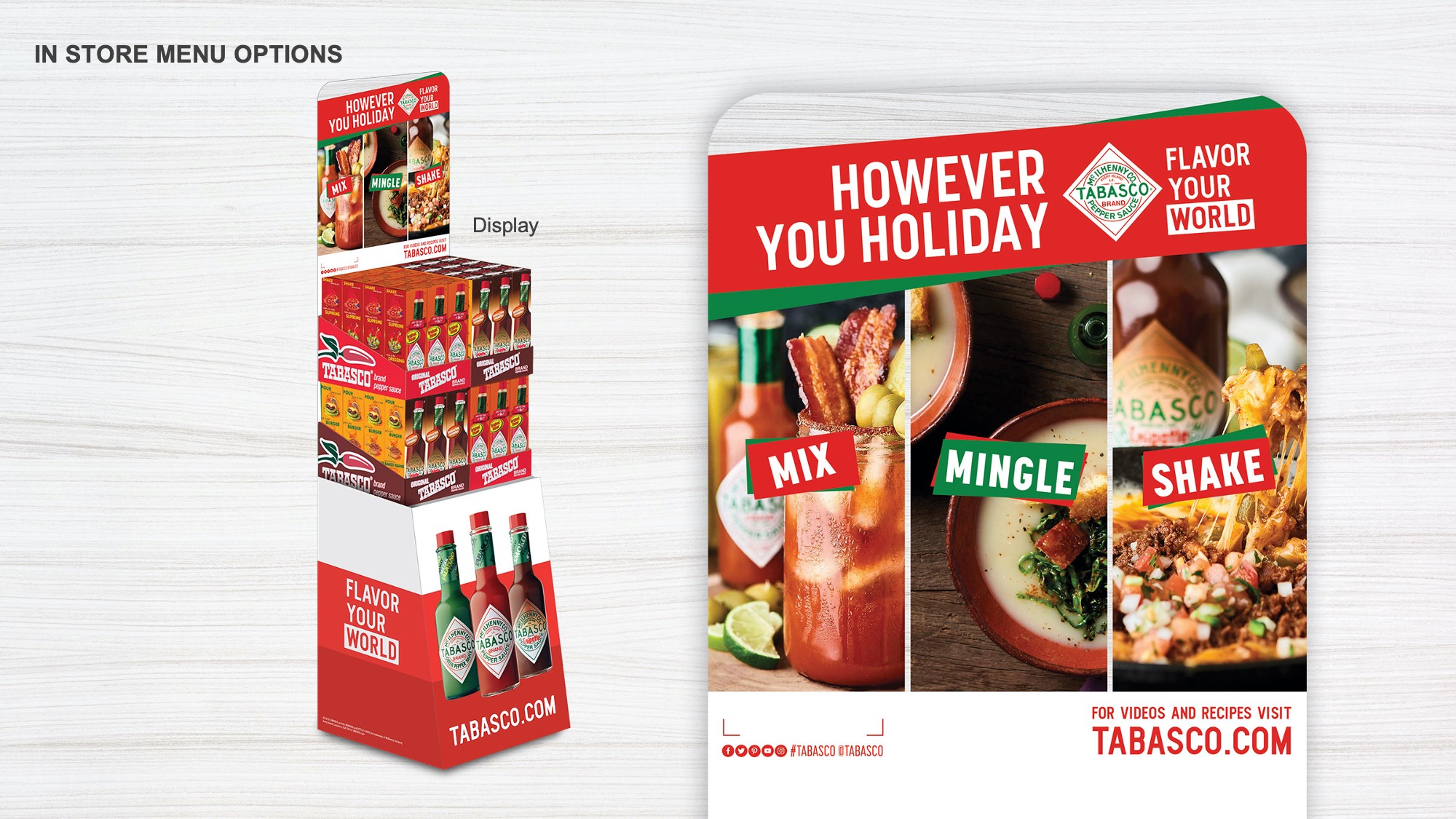 Tabasco Seasonal Program Dabbing spicy holiday cheer onto one host food at a time. Sprinkle in some national, retailer specific and partnership ideas and you have one happy client.