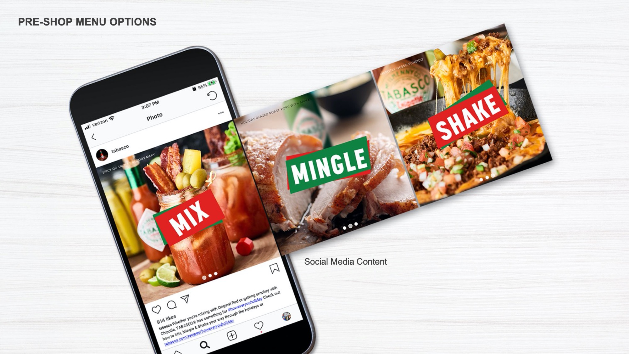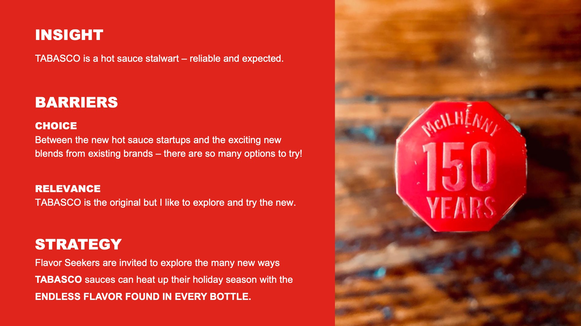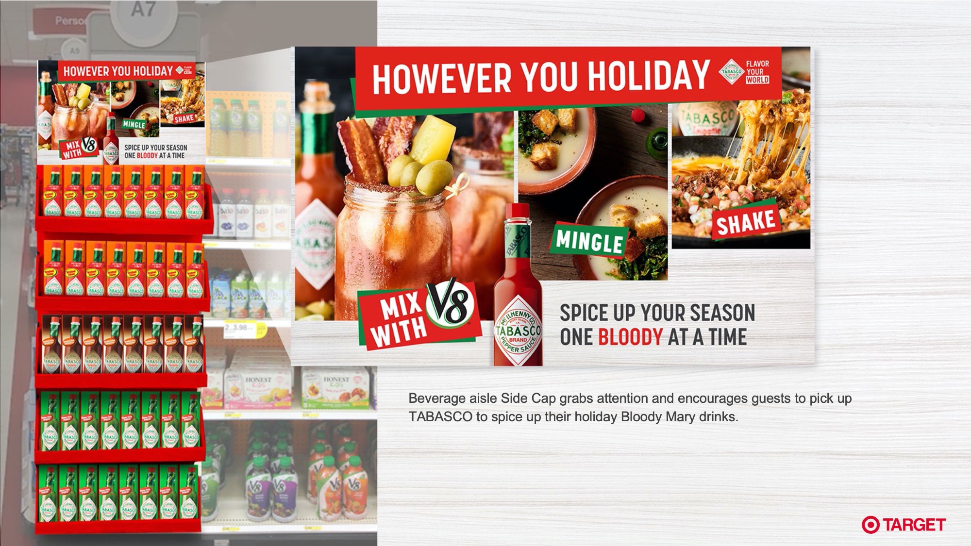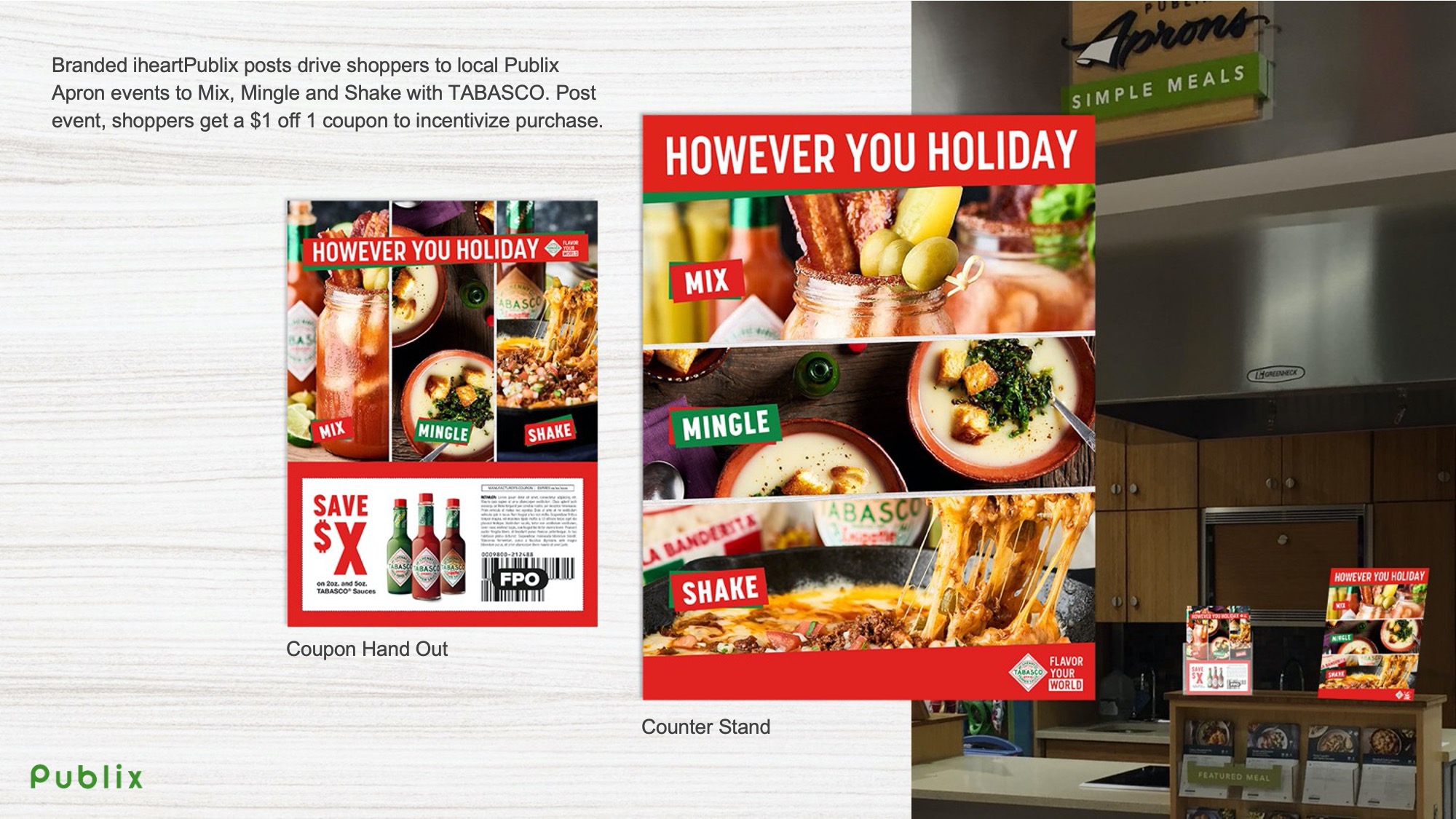 Tabasco Seasonal Program Dabbing spicy holiday cheer onto one host food at a time. Sprinkle in some national, retailer specific and partnership ideas and you have one happy client.
